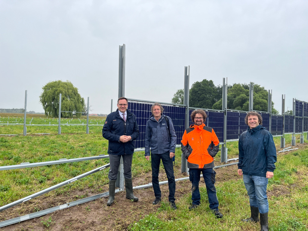 Bürgermeister Alexander von Seggern, Aufsichtsrat REALWeg Stefan Dreesmann, Bauleiter Fabio Gianfrancesco (Next2Sun) und Projektleiter Corbinian Schöfinius (kleVer)  beobachten den Baufortschritt der Agri-PV-Anlage in Dörverden. Langsam wird sichtbar, wie die Anlage aussehen soll und wo weiterhin geackert werden darf.